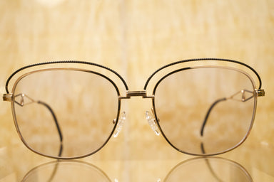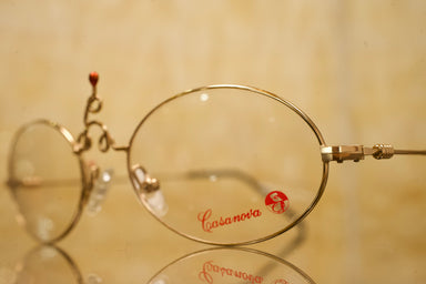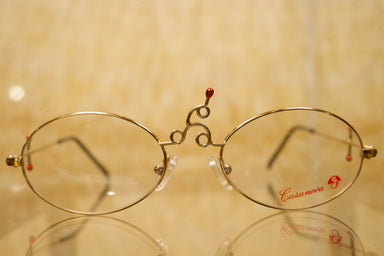 Country : Italy Material : Gold plated size : 46-18 1990年代にカサノヴァによって作られたアイウェア。 クラシックなレンズシェイプだが、捻れたブリッジとクロスのようなテンプルは まるでアート。 分かり易さと分かり難さが一緒に存在している。