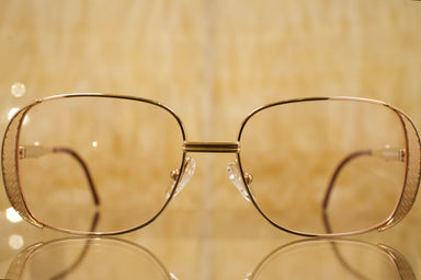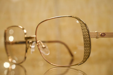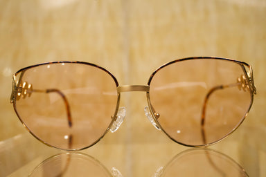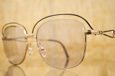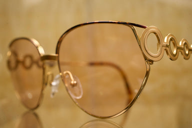 Country : Austria Material : Gold plated Size : 56-15 1980年代のクリスチャン・ディオールのアイウェア。 数珠のようなデザインのテンプルに目が行きがちだが、 美しいレンズシェイプにも注目したい。 目尻がキュッと上がるようにレンズシェイプが...