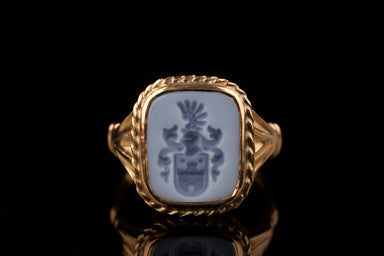 Country : Austria Material : 14K Yellow Gold & Agate Size : 15 Comment : オーストリア=ハンガリー帝国製のシグネットリング。 王冠を戴く盾と兜飾りをいただいた紋章意匠は、オーストリア=ハンガリー帝国期における家系...
