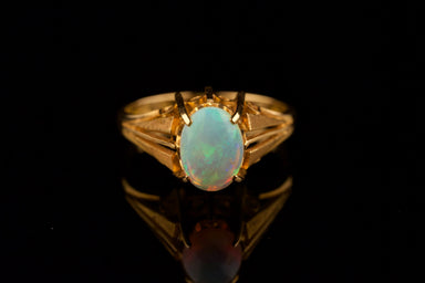 Country : Japan Material : 18K Yellow Gold x Opal Size : 8号(日本サイズ) Comment :  中央に一石という潔いデザインのリング。 オパールの虹色にゆらめくこの現象は遊色効果。 古代ローマの博物学者プリニウスはこの様々な色を併せ持...