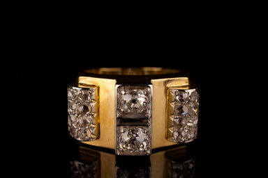 Country : France Material : 18K Yellow Gold & Diamonds Size : 7 Comment : 1940年代フランス製タンクリング。 第二次世界大戦中に戦争へのアンチテーゼとして造られた。 中央には2つのオールドヨーロピアンカットのダ...