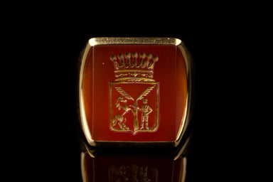 Country : Austria Material : 14K Yellow Gold & Carnelian Size : 20 Comment :  深みのある緋色のカーネリアンを印台に据えた、1920年代にオーストリアで造られたシグネットリング。 騎馬と騎士が向かい合うエンブレ...