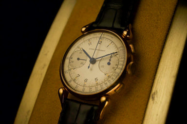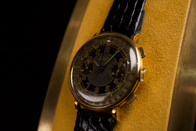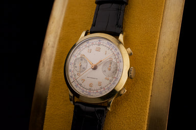 1940年代、無銘クロノグラフ Calibre: Valjoux22 Movement:手巻き/ Hand Wound Case:14KYG Belt: SOLAKZADE Original Aligator / ソラックザーデオリジナル アリゲーター 無名のクロノグラフ。 おそらくスイスの...