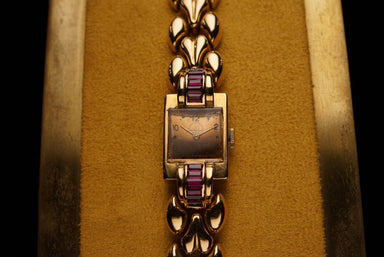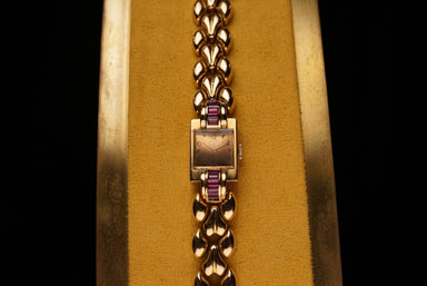 Calibre: 17J Movement: 手巻き / Hand Wound Case: 18KPG Bracelet: 18KPG Bracelet size: 13.5cm 滑らかな18KPGブレスレットと、バゲットカットのルビーが華やかな、1940年代製のジラール・ペルゴ。